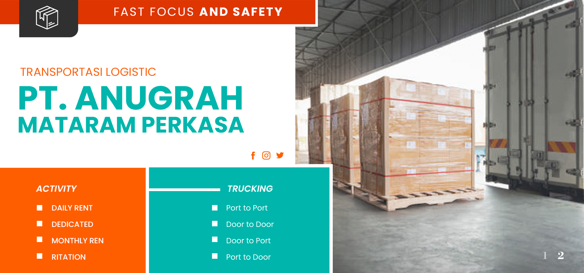Slogan kami, “FAST, FOCUS, AND SAFETY”, mencerminkan nilai-nilai inti kami: memberikan layanan yang cepat untuk memenuhi kebutuhan logistik Anda tepat waktu, tetap fokus pada setiap detail untuk memastikan kelancaran proses pengiriman, dan mengutamakan keamanan agar barang Anda sampai dengan kondisi yang terjaga.
